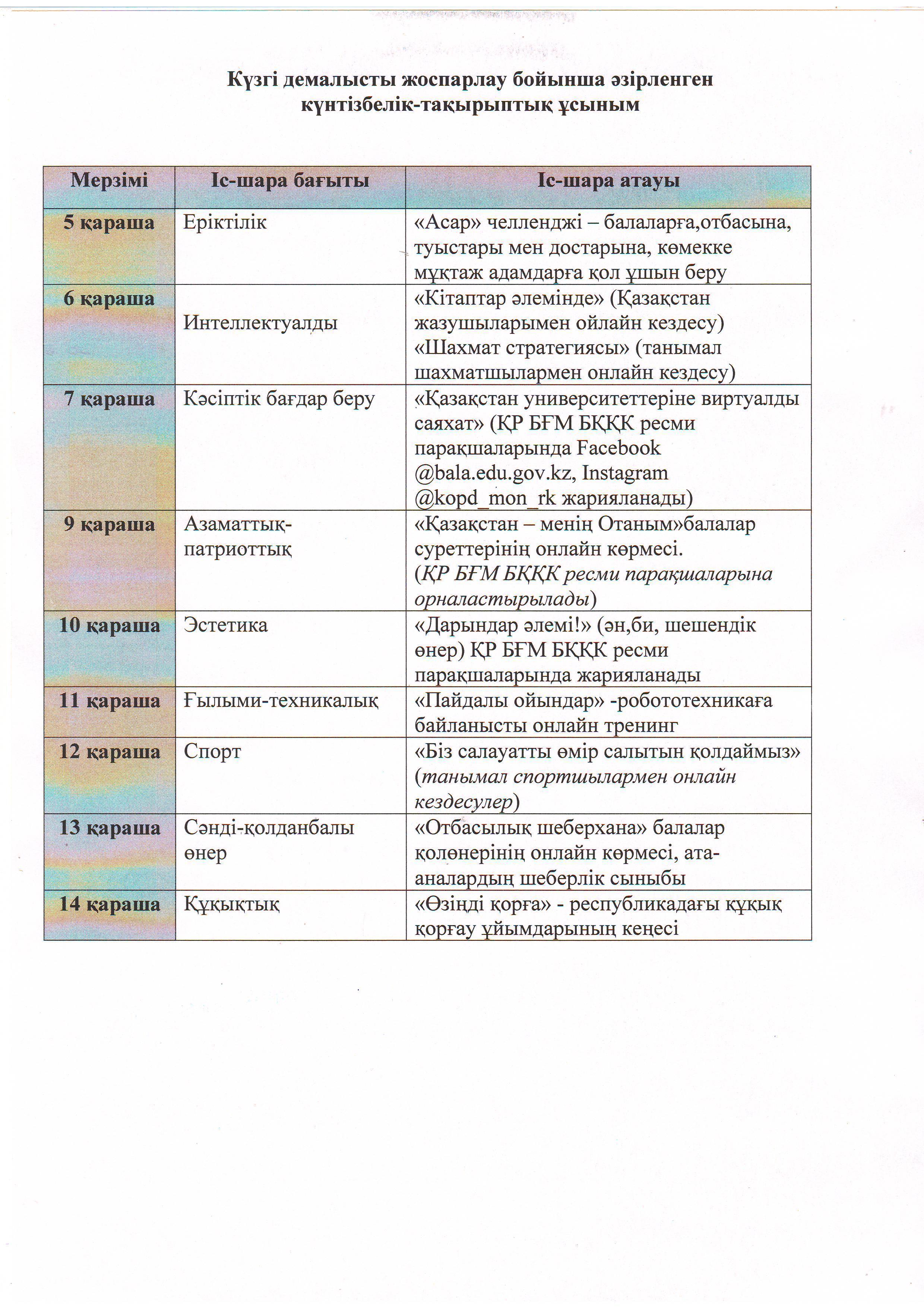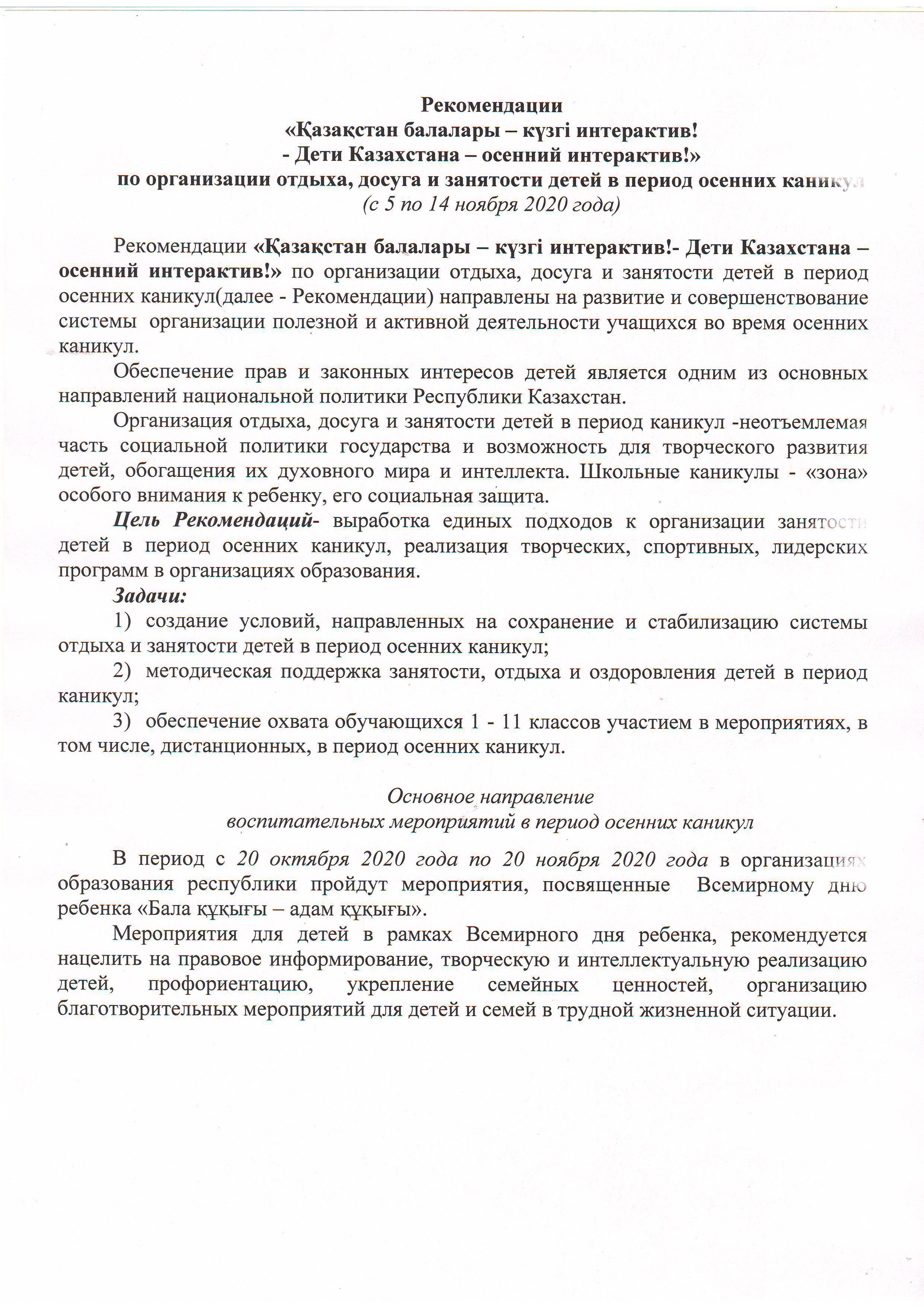 План работы по организации отдыха, досуга и занятости детей в период осенних каникул «Қазақстан балалары – күзгі интерактив! - Дети Казахстана–осенний интерактив!»