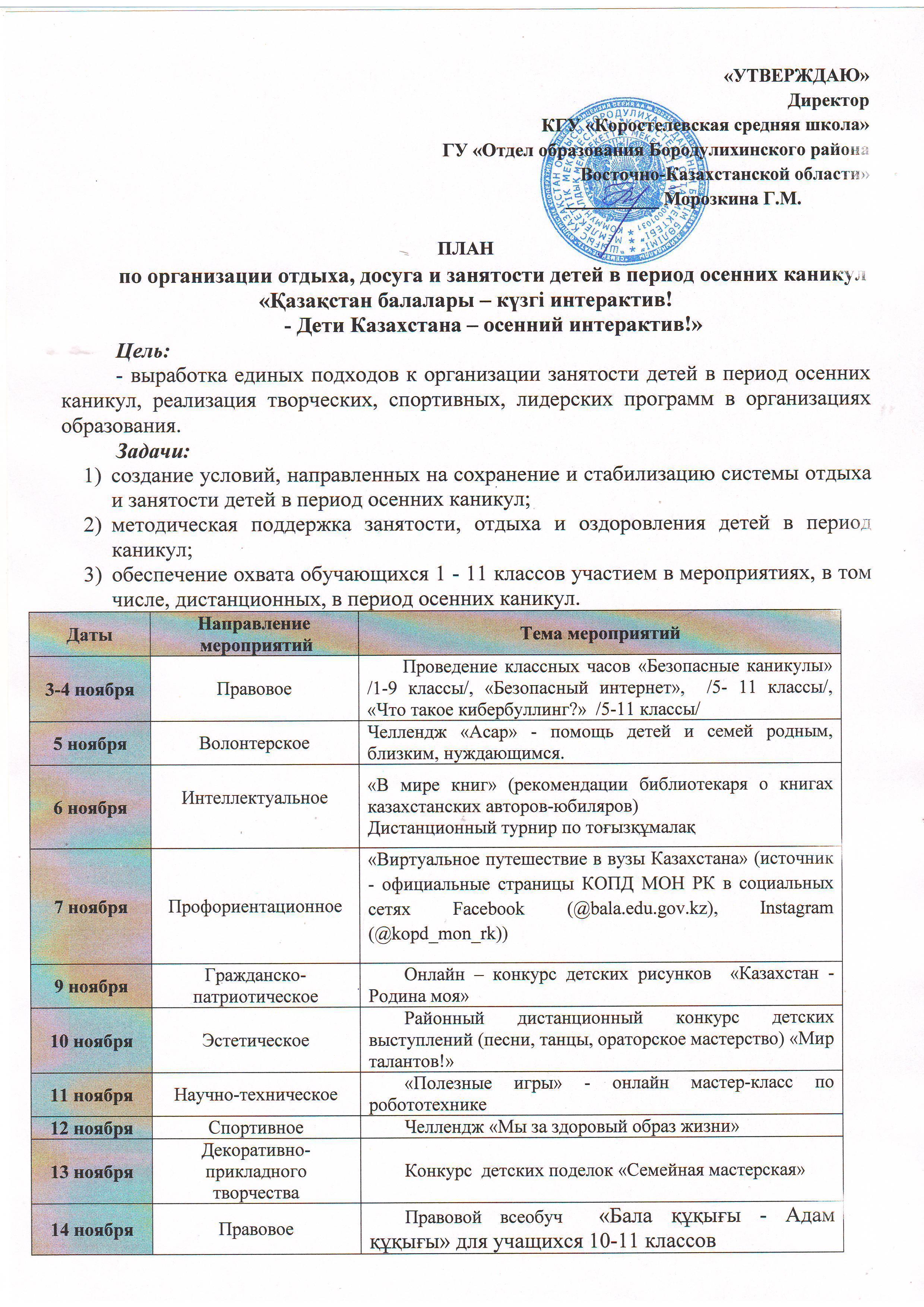 План работы по организации отдыха, досуга и занятости детей в период осенних каникул «Қазақстан балалары – күзгі интерактив! - Дети Казахстана–осенний интерактив!» » КГУ «Коростелевская средняя школа»