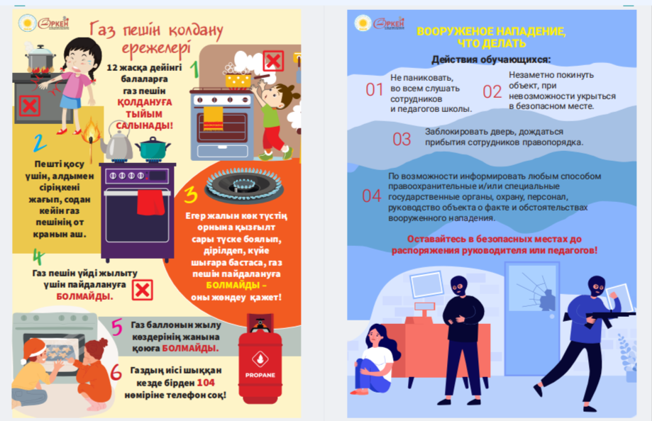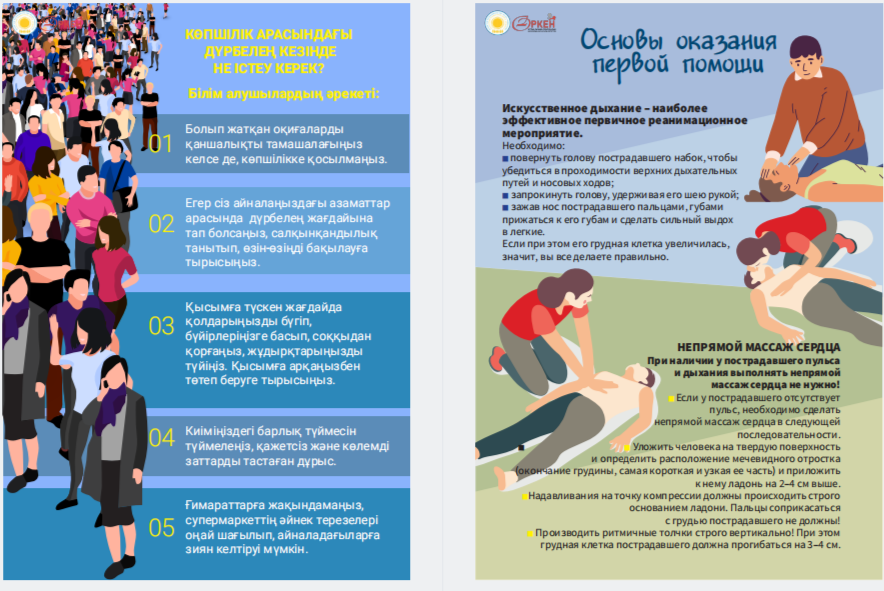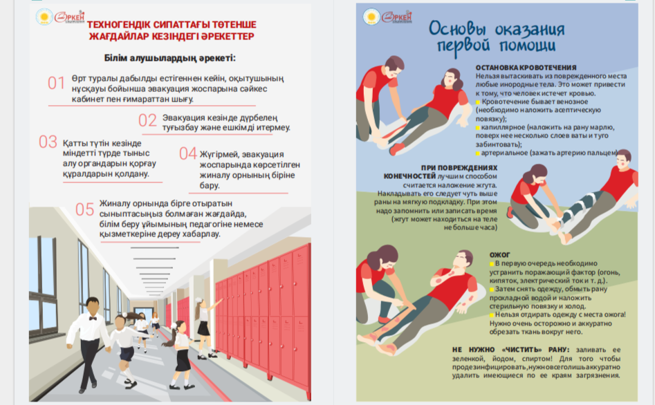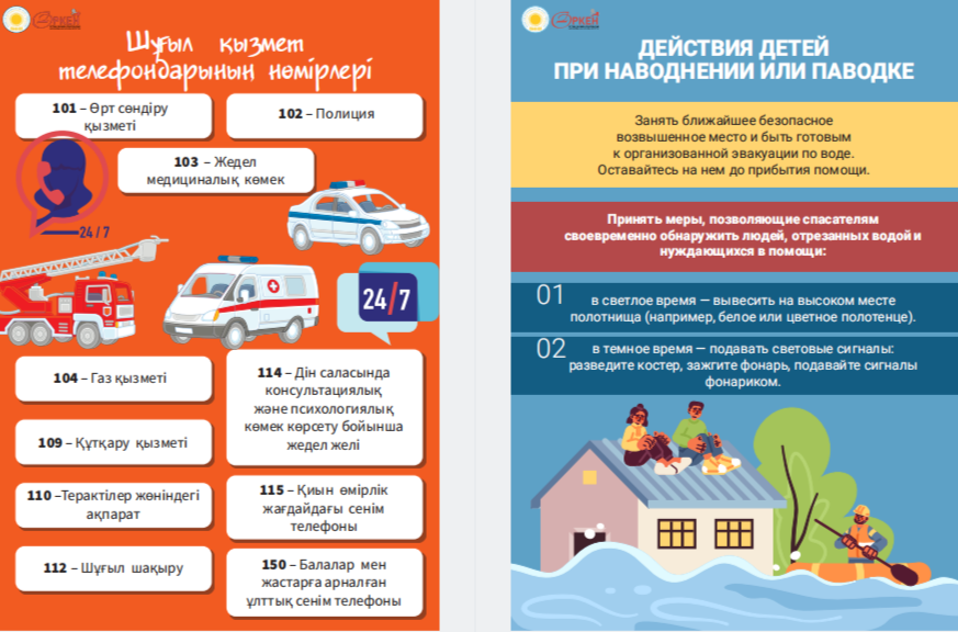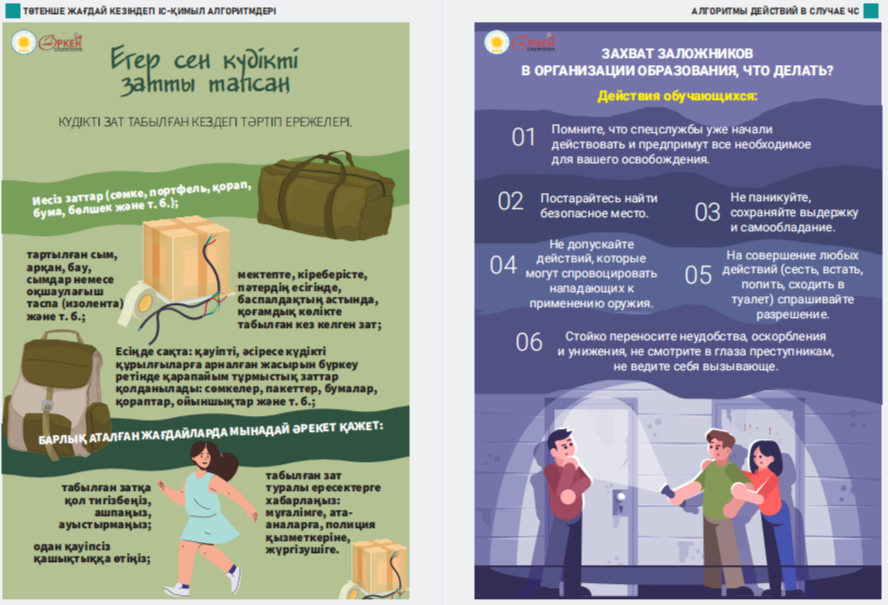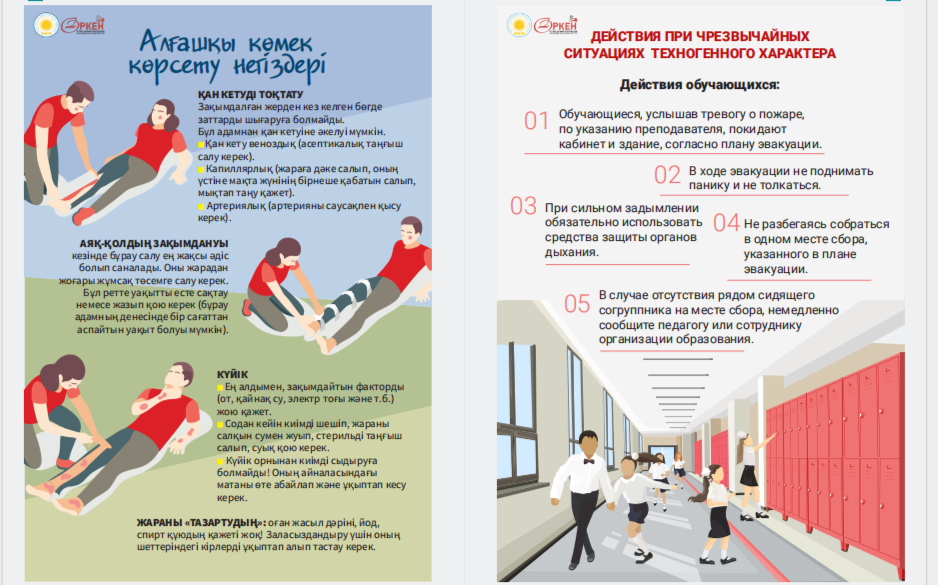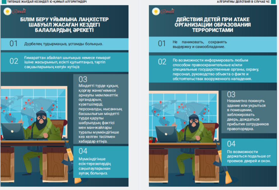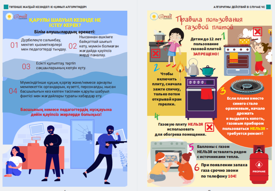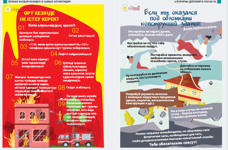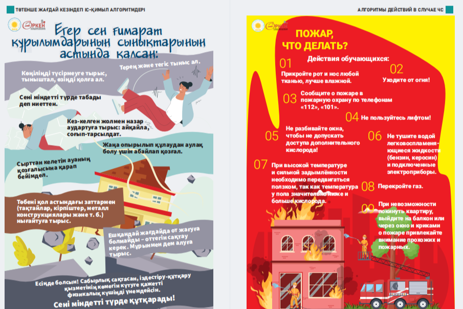 Сіздердің назарларыңызға «Төтенше жағдай кезіндегі іс-қимыл алгоритмдері» жаднамасын ұсынамыз - төтенше жағдайдағы балалар үшін таптырмас көмекші. Онда сіздің балаңызға қиын жағдайда өз өмірі мен денсаулығын сақтауға көмектесетін мінез-құлық ережелері, қорғау әдістері мен іс-қимыл бойынша ұсыныстар жинақталған. Бұл жаднама мектеп жасындағы балаларға төтенше жағдайда дұрыс әре- кет етуге үйрету үшін арнайы жасалған. Біз ата-аналар мен мұғалімдерді осы материалмен танысуға және оны балалармен талқылауға шақырамыз, осылайша әр оқушы қиын жағдайда қалай әрекет ету керектігін біледі. Бұл жадынама балаларға өзін-өзі қорғаудың маңызды дағды- ларын үйретуде сенімді көмекші болсын және оларға кез келген төтенше жағдайда сабырлы және жинақы болуға көмектессін. Барлығына қауіпсіздік пен сенімділік тілейміз! Представляем вашему вниманию памятку «Алгоритмы действий в случае ЧС» – незаменимый помощник для детей в чрезвычайных ситуациях. В ней собраны правила поведения, способы защиты и рекомендации по действиям, которые помогут вашему ребенку сохранить свою жизнь и здоровье в критической ситуации. Эта памятка предназначена специально для детей школьного возраста, чтобы обучить их правильно ориентироваться и действовать в случае чрезвычайных обстоятельств. Мы призываем родителей и педагогов ознакомиться с этим материалом и обсудить его с детьми, чтобы каждый школьник знал, как поступить в сложной ситуации. Пусть эта памятка станет надежным помощником в обучении детей важным навыкам самозащиты и поможет им оставаться спокойными и собранными в любых экстренных ситуациях. Желаем всем безопасности и уверенности!
