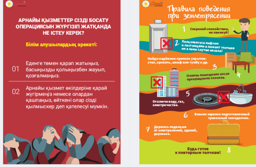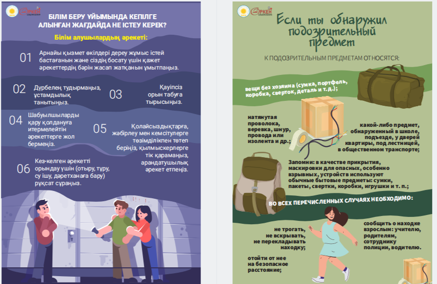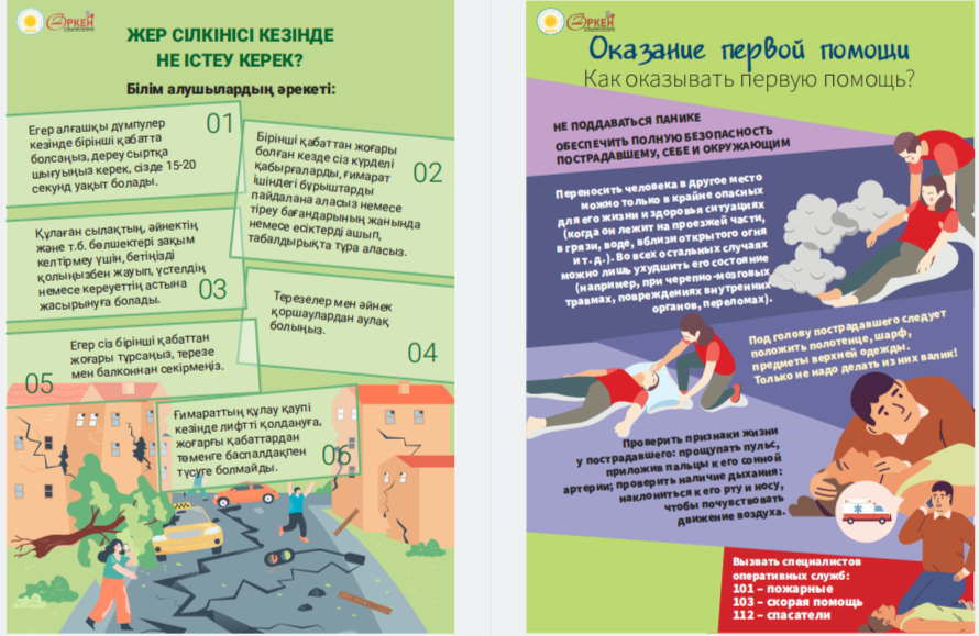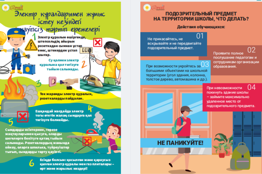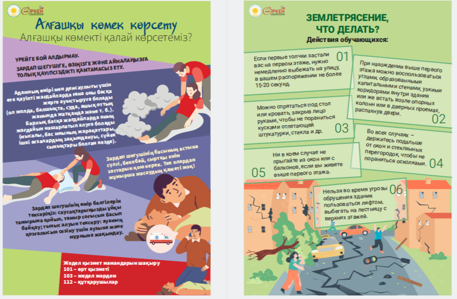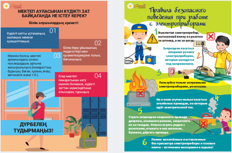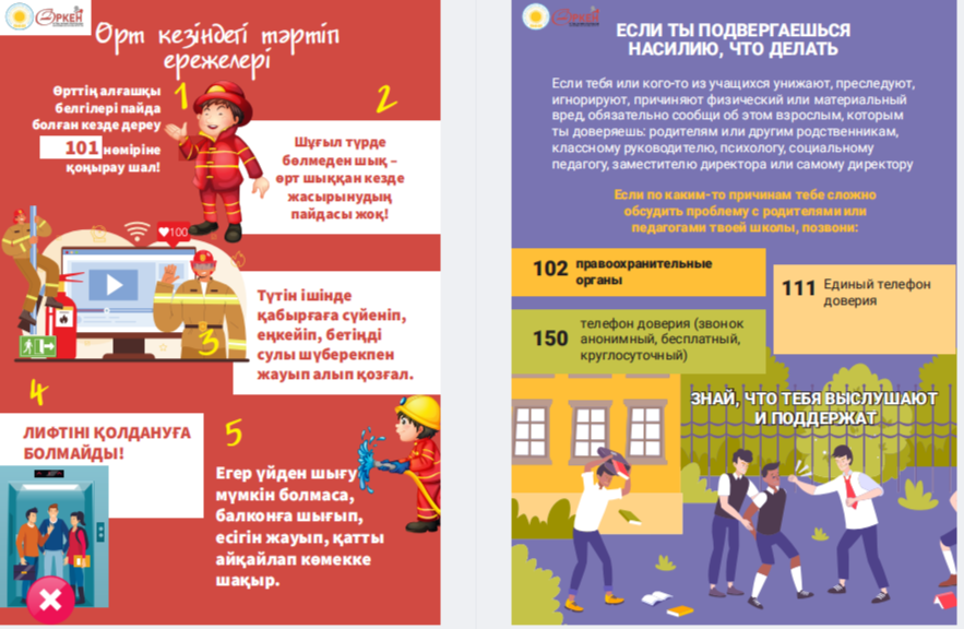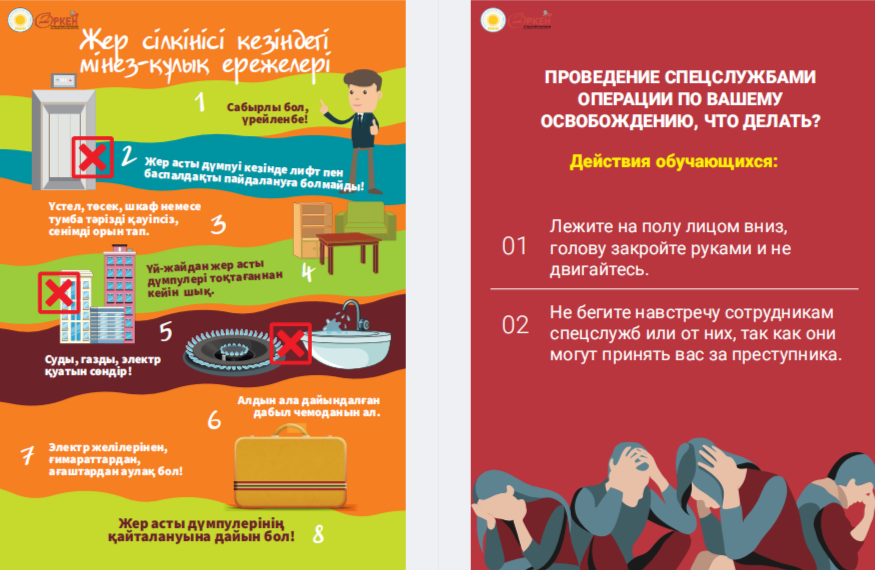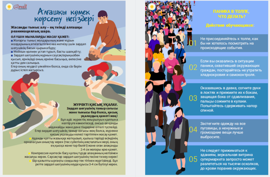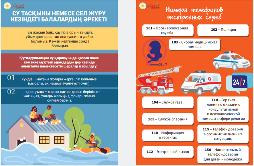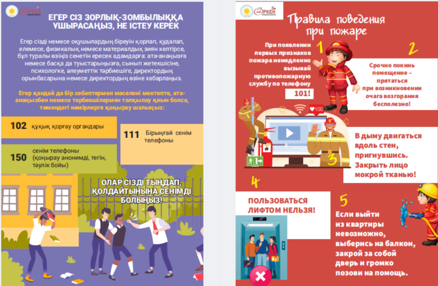 Сіздердің назарларыңызға «Төтенше жағдай кезіндегі іс-қимыл алгоритмдері» жаднамасын ұсынамыз - төтенше жағдайдағы балалар үшін таптырмас көмекші. Онда сіздің балаңызға қиын жағдайда өз өмірі мен денсаулығын сақтауға көмектесетін мінез-құлық ережелері, қорғау әдістері мен іс-қимыл бойынша ұсыныстар жинақталған. Бұл жаднама мектеп жасындағы балаларға төтенше жағдайда дұрыс әре- кет етуге үйрету үшін арнайы жасалған. Біз ата-аналар мен мұғалімдерді осы материалмен танысуға және оны балалармен талқылауға шақырамыз, осылайша әр оқушы қиын жағдайда қалай әрекет ету керектігін біледі. Бұл жадынама балаларға өзін-өзі қорғаудың маңызды дағды- ларын үйретуде сенімді көмекші болсын және оларға кез келген төтенше жағдайда сабырлы және жинақы болуға көмектессін. Барлығына қауіпсіздік пен сенімділік тілейміз! Представляем вашему вниманию памятку «Алгоритмы действий в случае ЧС» – незаменимый помощник для детей в чрезвычайных ситуациях. В ней собраны правила поведения, способы защиты и рекомендации по действиям, которые помогут вашему ребенку сохранить свою жизнь и здоровье в критической ситуации. Эта памятка предназначена специально для детей школьного возраста, чтобы обучить их правильно ориентироваться и действовать в случае чрезвычайных обстоятельств. Мы призываем родителей и педагогов ознакомиться с этим материалом и обсудить его с детьми, чтобы каждый школьник знал, как поступить в сложной ситуации. Пусть эта памятка станет надежным помощником в обучении детей важным навыкам самозащиты и поможет им оставаться спокойными и собранными в любых экстренных ситуациях. Желаем всем безопасности и уверенности!