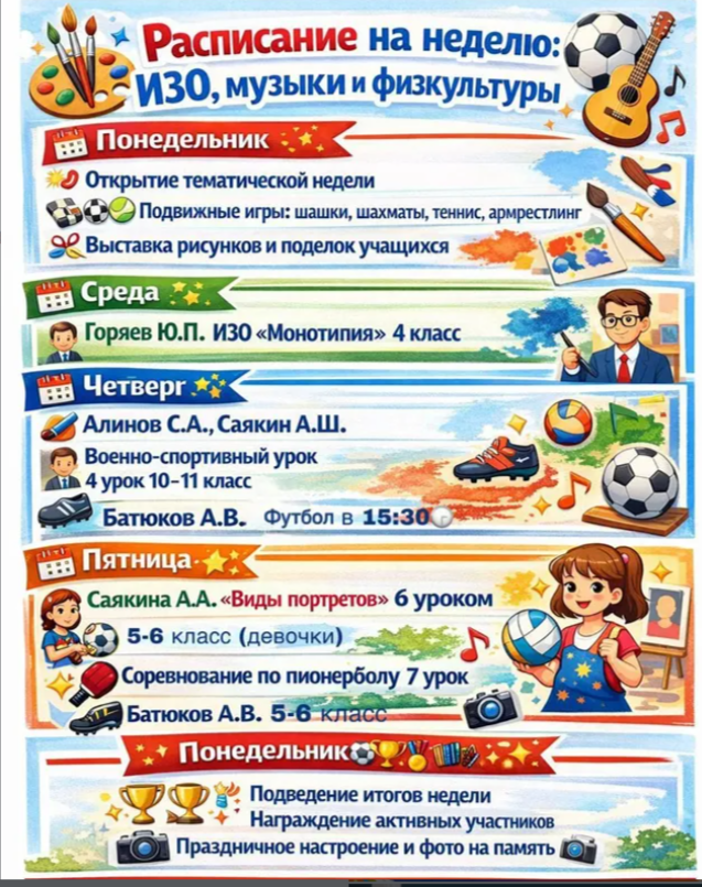 » » Расписание на неделю ИЗО, музыки и физкультуры.