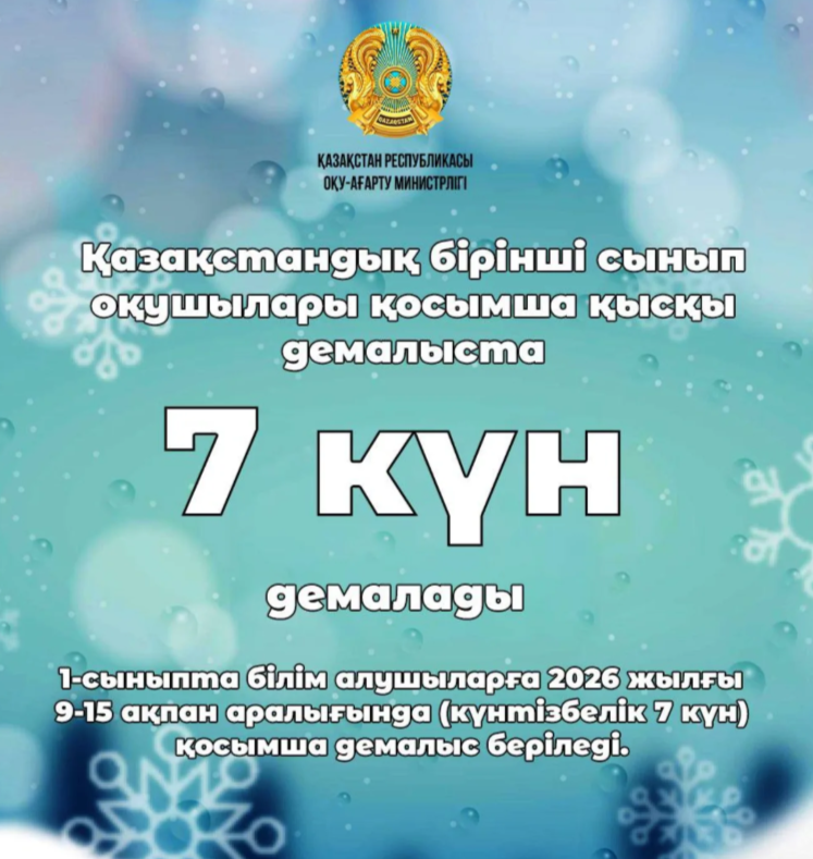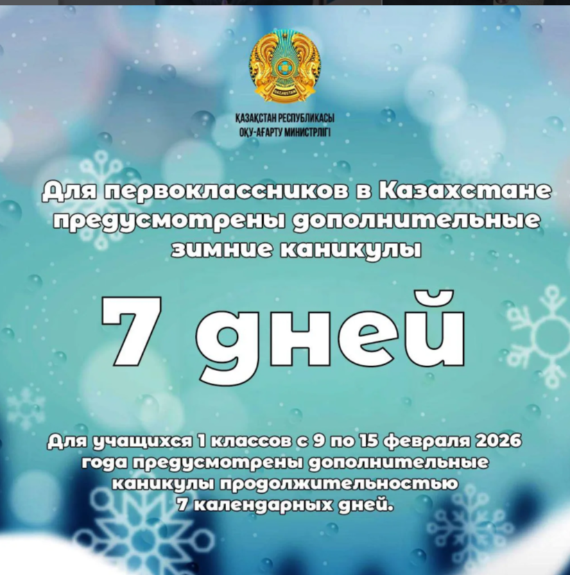 🎒 1-сыныпта білім алушыларға 2026 жылғы 9-15 ақпан аралығында (күнтізбелік 7 күн) қосымша демалыс беріледі.