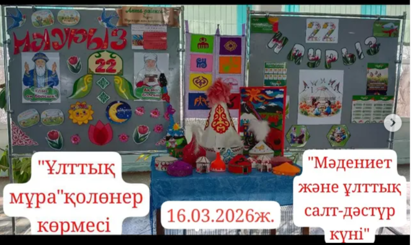 "Адал азамат" біртұтас тәрбие бағдарламасының наурыз айындағы «Тәуелсіздік және патриотизм» құндылығын іске асыру аясындағы "Наурызнама онкүндігі" жоспарына сай көркем еңбек пәнінің ұстаздары Ю.П.Горяев пен А.А.Саякина «Ұлттық мұра» қолөнер көрмесін ұйымдастырды. Көрмеге оқушылардың ұлттық өнерді насихаттайтын туындылары қойылды.