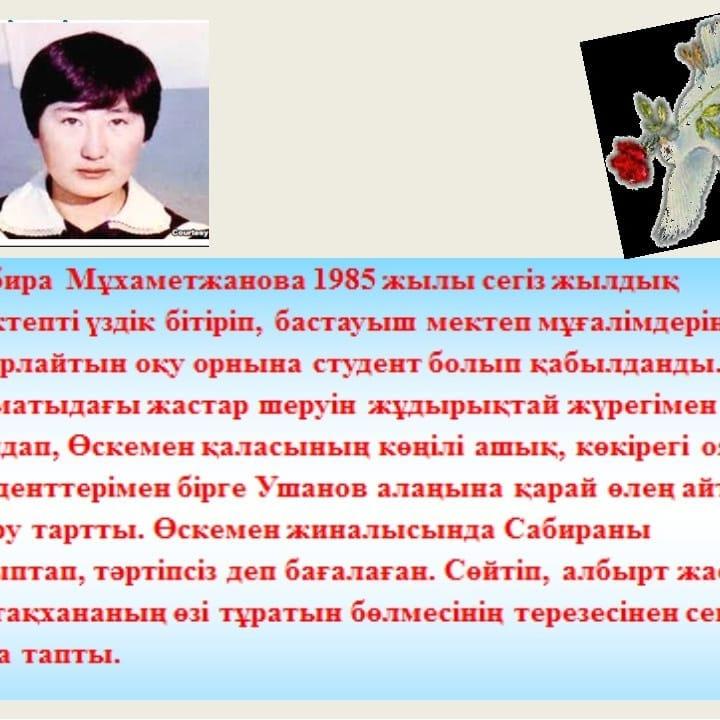 "ҚАҺАРМАН ҚАЗАҚ ҚЫЗЫ" Немало героев среди казахстанцев, которые стремились к независимости. Печальные декабрьские события 1986 года свидетельствуют об этом. Одной из тех, кто пострадал за свободу и независимость стала Сабира Мухамеджанова — она, как и многие представители молодого поколения казахстанцев в конце 80-х надеялась на счастливое будущее для своей страны, но ей не суждено было его увидеть... 27 участников декабрьских событий из Восточно-Казахстанской области были наконец оправданы. Об этом рассказали они сами нашим корреспондентам. Сабира Мухамеджанова родилась 1 января 1970 года в ауле Акмектеп Тарбагатайского района. В 1984 году поступила в Усть-Каменогорское педагогическое училище. Она была активисткой декабрьских событий, и вместе с сотнями казахстанцев вышла на мирный митинг, чтобы добиться справедливости, но на нее повесили клеймо националистки... После обвинений, судебных распрей, клеветы, 16-летняя Сабира свела счеты с жизнью. И она — одна из многих. Интересно, что 27 девушек из Восточно-Казахстанской области были реабилитированы не на Востоке, а с помощью сотрудников прокуратуры Алматы. Те, кто занимался этим непростым делом, не скрывают, что им сложно было получить данные из областного архива, собрать необходимые документы, оформить их. Поэтому обращались к алматинцам. И все-таки, труд был оправдан и достиг намеченной цели. Эхо декабрьских событий быстро разнеслось по казахстанской земле. Активисты во многих регионах страны поддержали движение. Не исключение — и наши земляки. Фарида Темиргалиева участвовала в мирном митинге, и за это ее назвали «опасной националисткой». Женщина до сих пор с дрожью в голосе говорит о том времени. Вспоминает о пережитом и однокурсница Сабиры Еркежан Абдырахманова. Участники общественного объединения «Желтоксан», которое занимается проблемой реабилитации участников декабрьских событий, верят, что прошлое не прощает ошибок. Главное — не терять связь со своей историей, не останавливаться на пути к восстановлению справедливости, не забывать о людях, пострадавших за наше будущее.