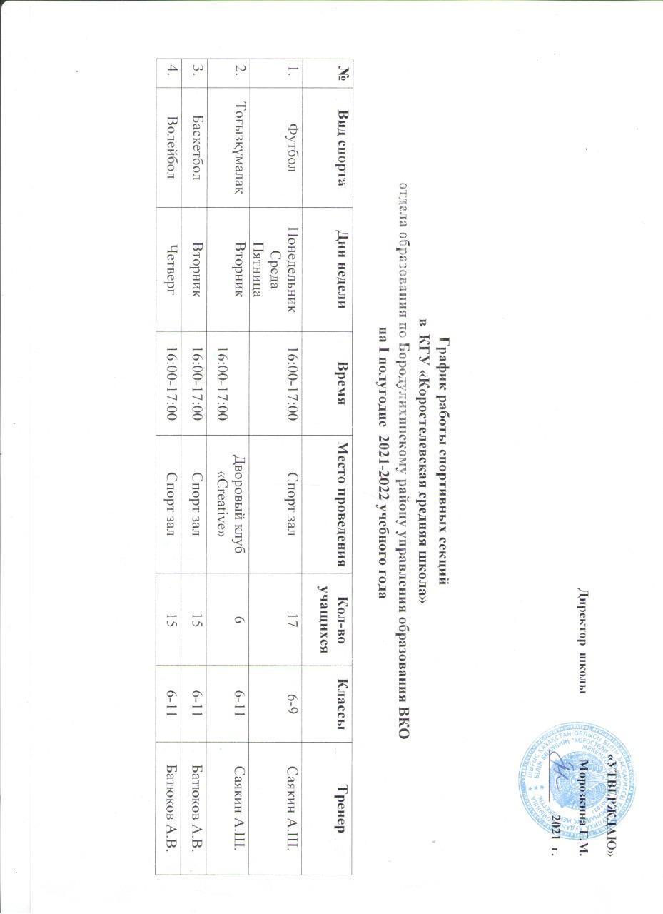График работы спортивных секции в "КГУ Коростелевская средняя школа" отдела образования по Бородулихинскому району управления образования ВКО на I полугодие 2021-2022 учебного года » КГУ «Коростелевская средняя школа»
