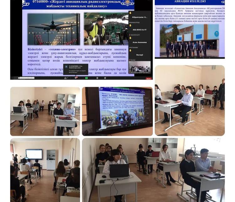 2022 жылы сәуір айының 20 сы күні 9-11 сынып оқушыларына Авиация колледжі "Азаматтық Авиация Академиясы" АҚ zoom платформасы арқылы кәсіптік бағдар беру туралы түсіндіру жүргізді.