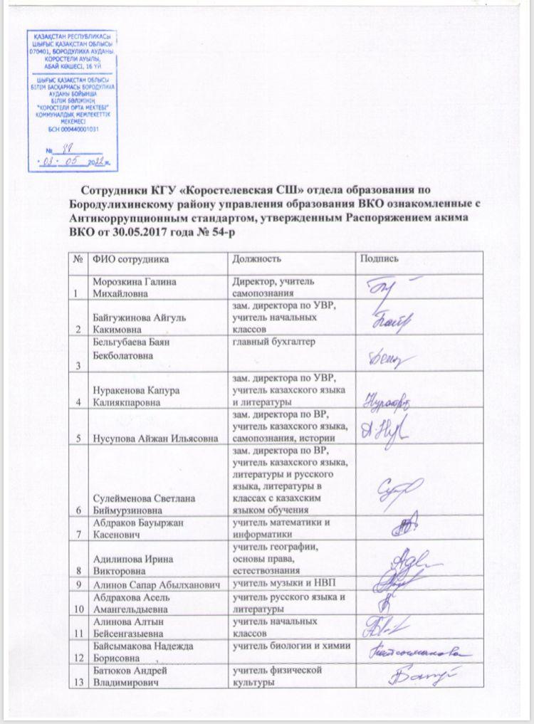 КГУ «Коростелевская средняя школа» » Информация » Сотрудники КГУ "Коростелевская СШ" отдела образования по Бородулихинскому району управления образования ВКО ознакомлены с антикоррупционным стандартом,утвержденным распоряжением акима ВКО от 30.05.2017г №54-р