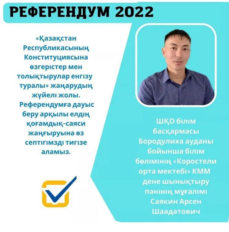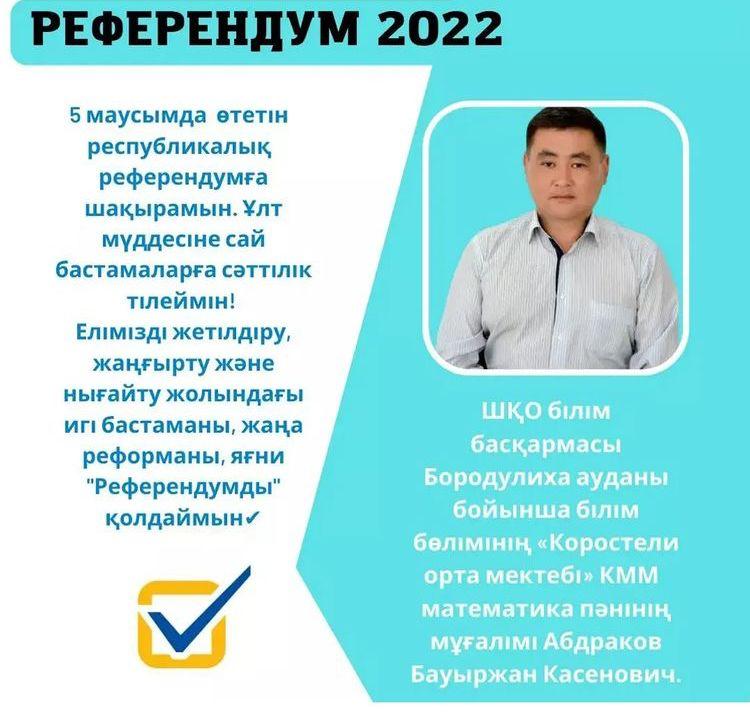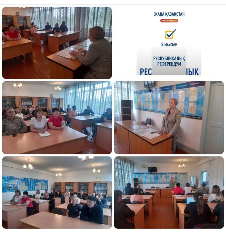 ШҚО білім басқармасы Бородулиха ауданы бойынша білім бөлімінің «Коростели орта мектебі» КММ директоры Г.М. Морозкина мектеп ұжымымен 5 маусымда өтетін республикалық референдум жайлы жиын өткізді. Дауыс беру арқылы әрбір Қазақстан азаматы елдің қоғамдық-саяси жаңғыруына өз септігін тигізе алатынын атап өтті. "Біз өзіміздің белсенді азаматтық ұстанымымызды көрсетуге тиіспіз. Өйткені біздің мақсатымыз-жаңа Қазақстан құру. Еліміздің болашағы әрқайсымыздың таңдауымызға байланысты" -деп, сөзін аяқтады.#тәуелсізқазақстан