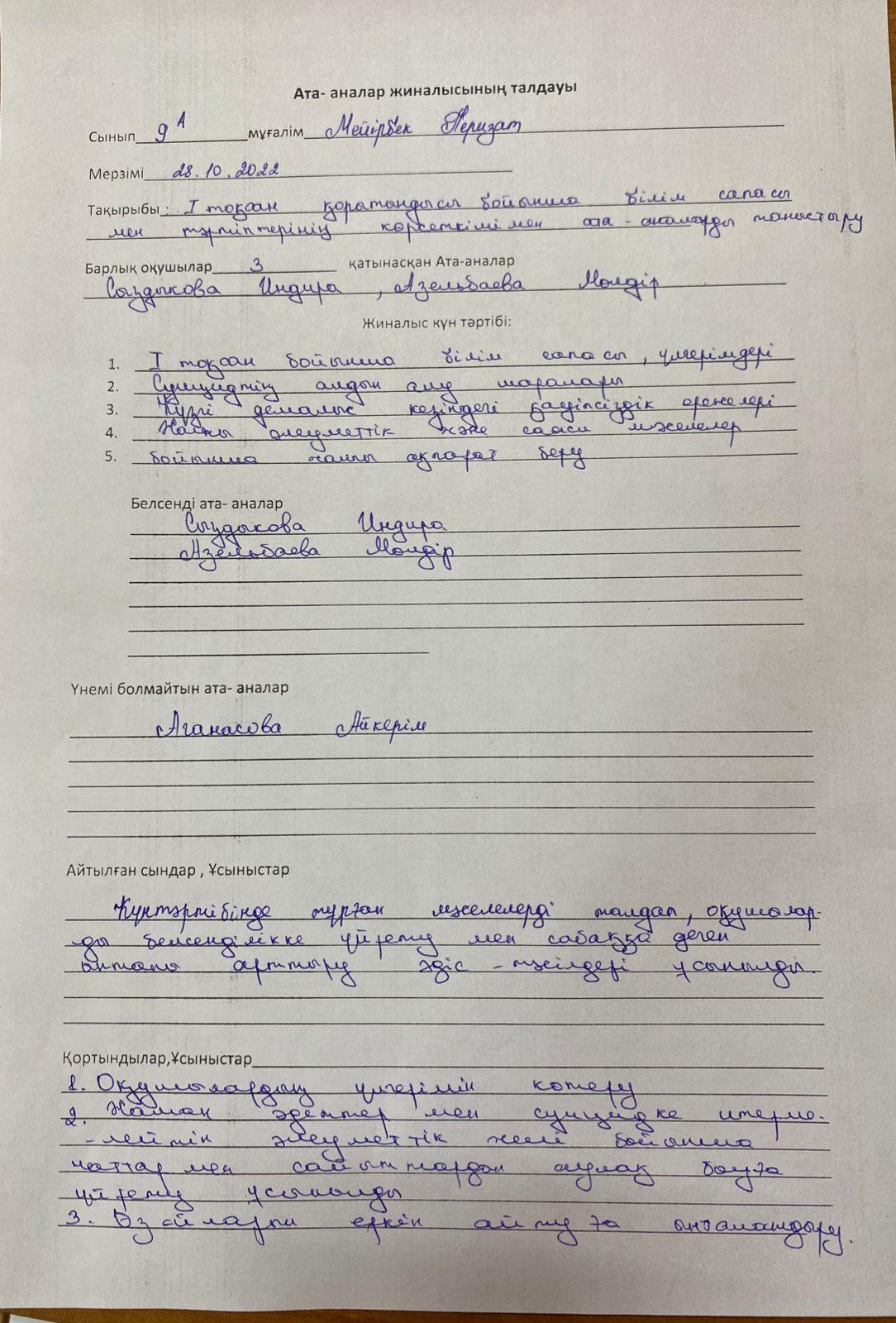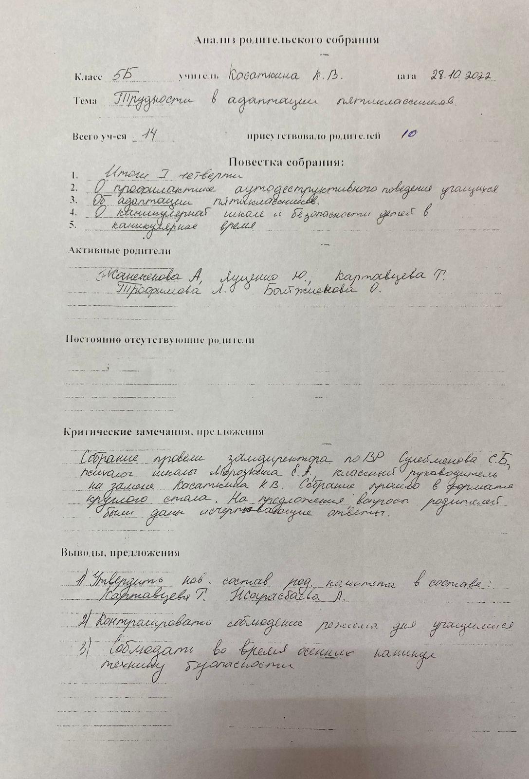 28 октября 2022 года в 5"Б" и 9 "А" казахском классе КГУ"Коростелевская СШ" отдела образования Бородулихинского района управления образования области Абай состоялось родительское собрание. Рассматривались следующие вопросы: 1.Итоги 1четверти 2. О профилактике аутодеструктивного поведения учащихся 3. Об адаптации пятиклассников 4. О каникулярной школе и безопасности детей в каникулярное время. Собрание провели замдиректора по ВР Сулейменова С.Б, психолог школы Морозкина Е.А, классный руководитель на замене Касаткина К В. Собрание прошло в формате круглого стола. На предложения, вопросы родителей были даны исчерпывающие ответы.