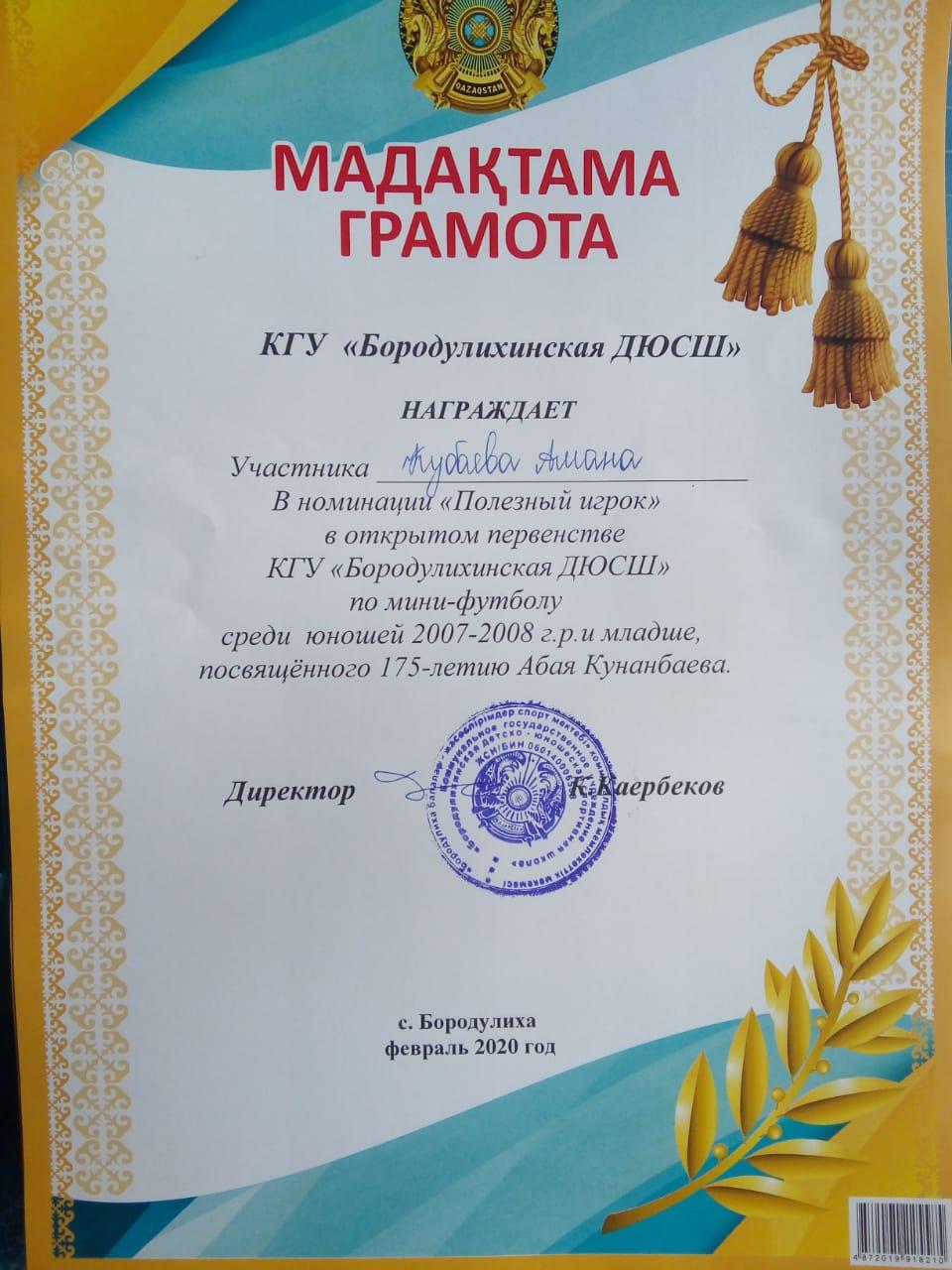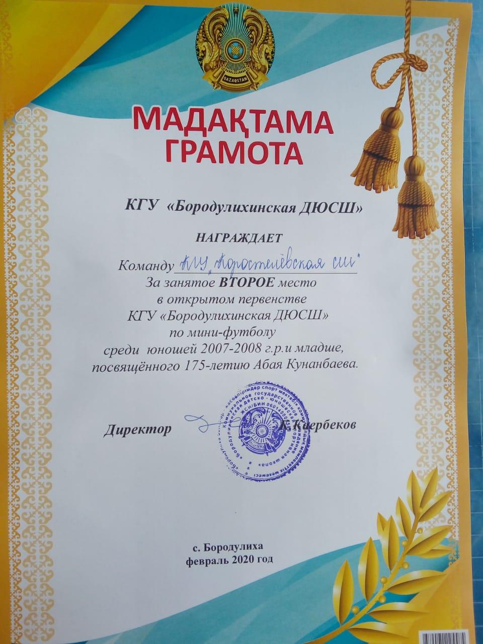 8 ақпан күні Бородулиха ауданында Абай Құнанбайұлының 175 жылдығына арналған 2007-2008 жылы туылған және одан кіші оқушылар арасында өткізілген шағын-футболдан жарыста біздің мектептің оқушылары ІІ орын иеленді. Сонымен қатар, 6 "б" сынып оқушысы Кубаев Аман"Пайдалы ойыншы" ("Полезный игрок") номинациясында марапатталды. Жаттықтырушысы: Саякин Арсен Шаадатович. ҚҰТТЫҚТАЙМЫЗ!!!