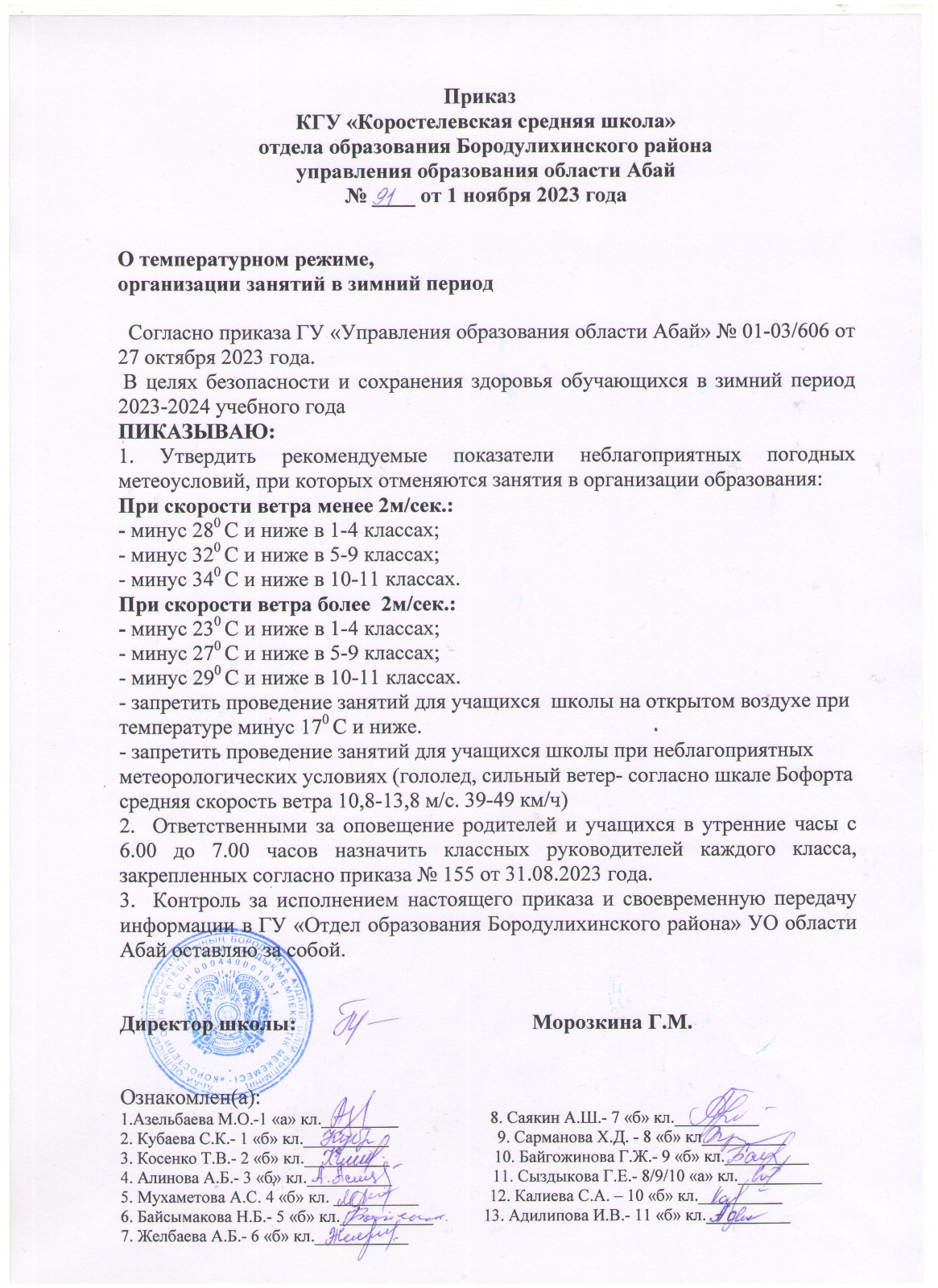 Приказ КГУ «Коростелевская средняя школа» отдела образования Бородулихинского района управления образования области Абай № 91 от 1 ноября 2023 года. О температурном режиме, организации занятий в зимний период. » КГУ «Коростелевская средняя школа»