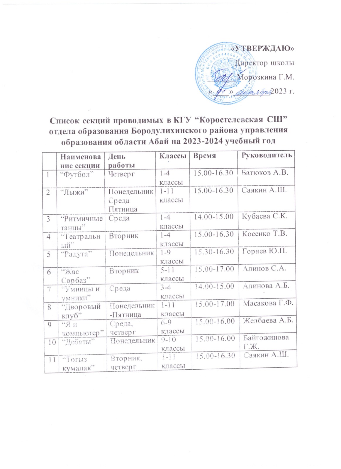 Список проводимых секций за 2023-2024 год » КГУ «Коростелевская средняя школа»