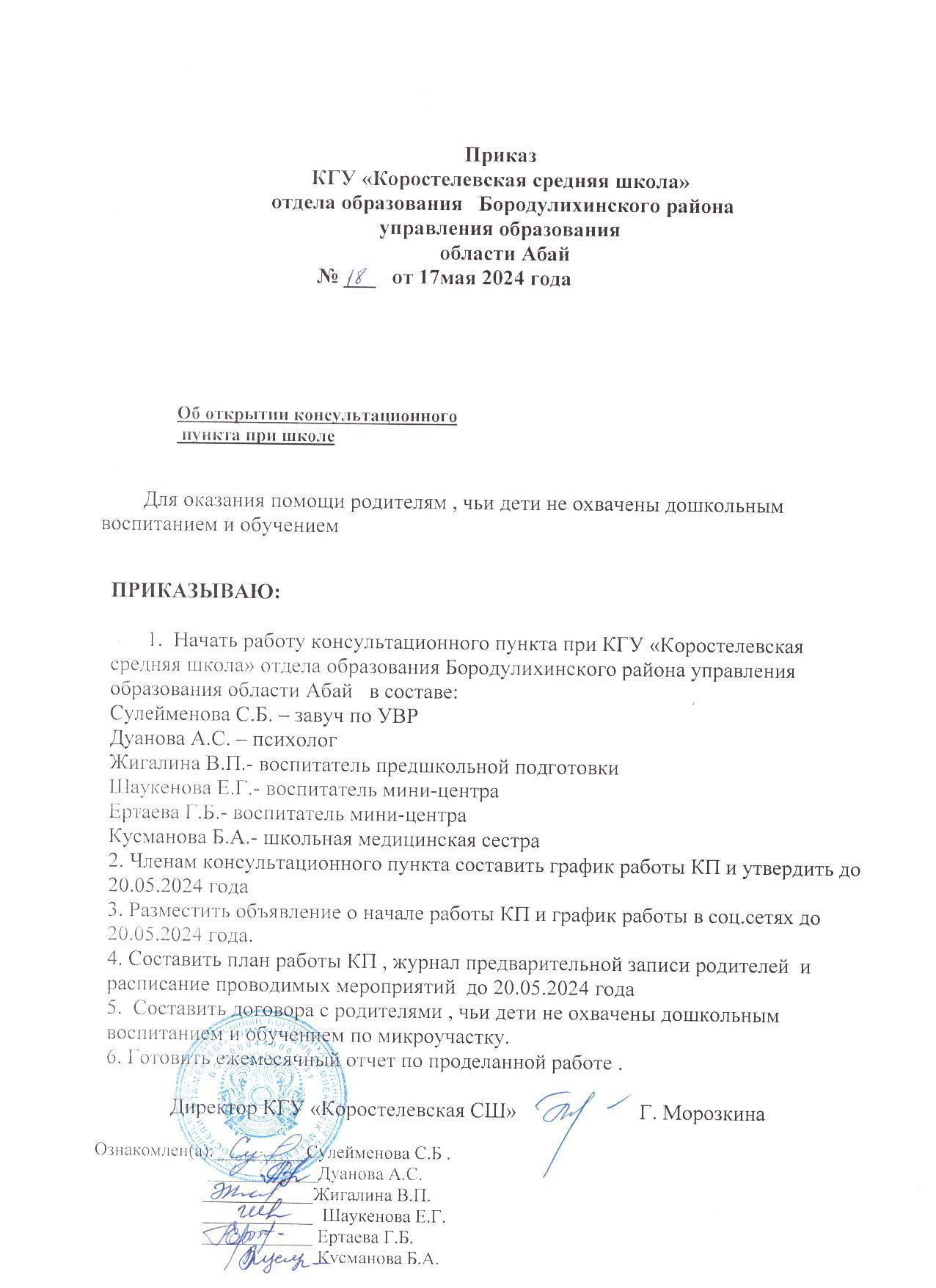 Приказ: " Об открытии консультативного пункта при школе" » КГУ «Коростелевская средняя школа»