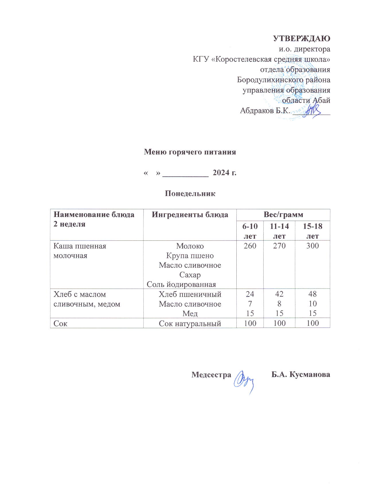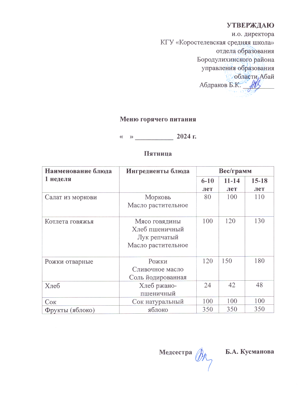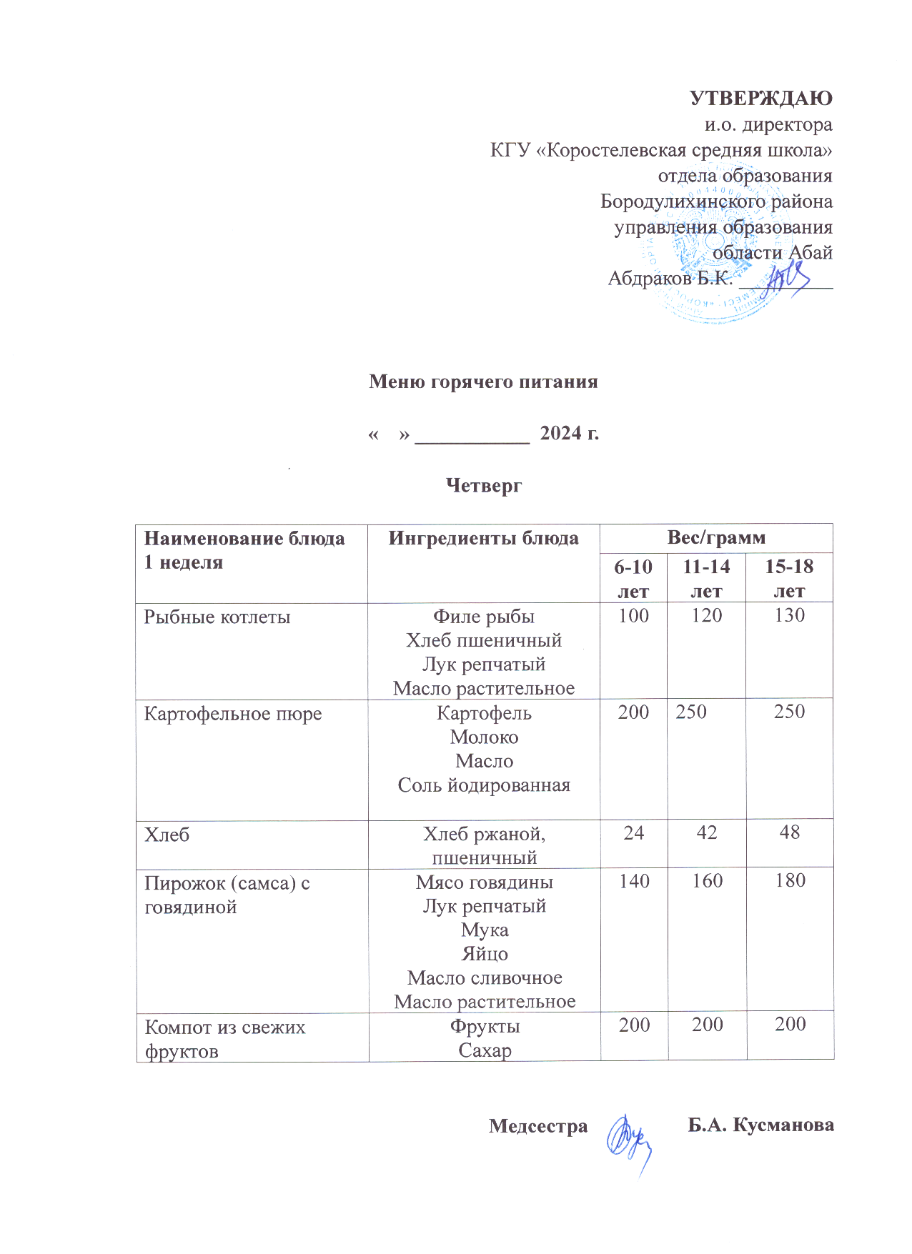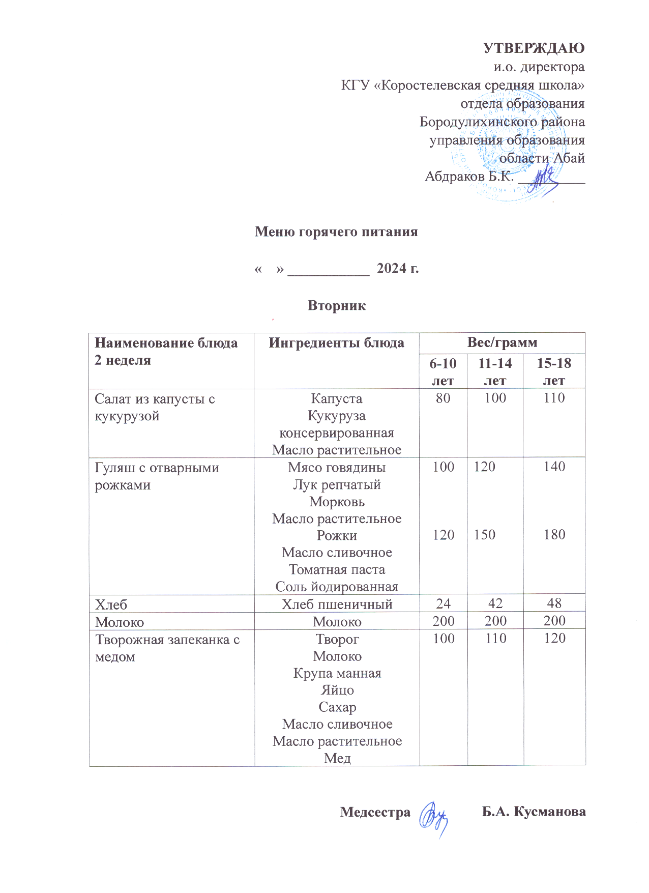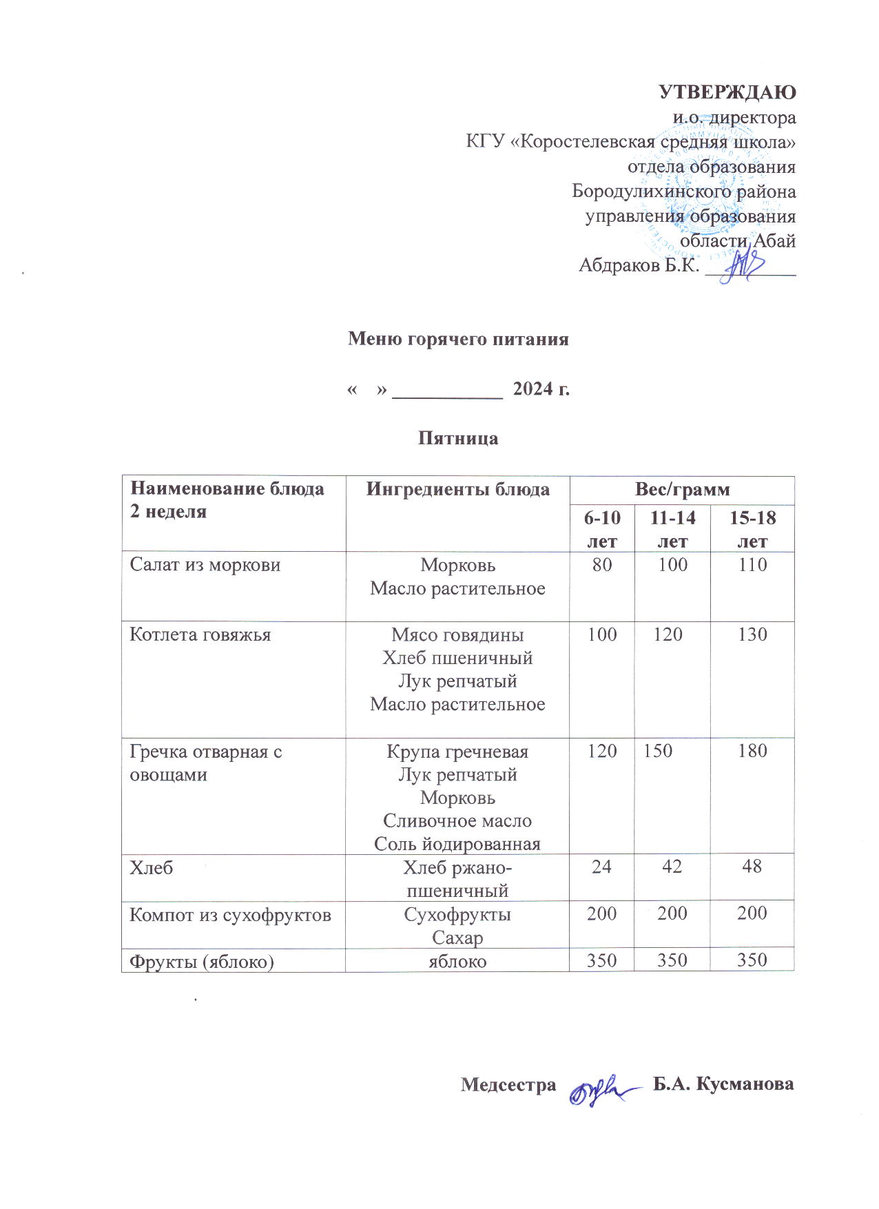 Меню горячего питания школьной столовой 2024-2025 уч.год » КГУ «Коростелевская средняя школа»
