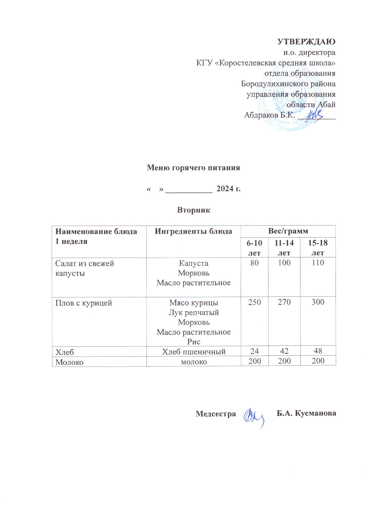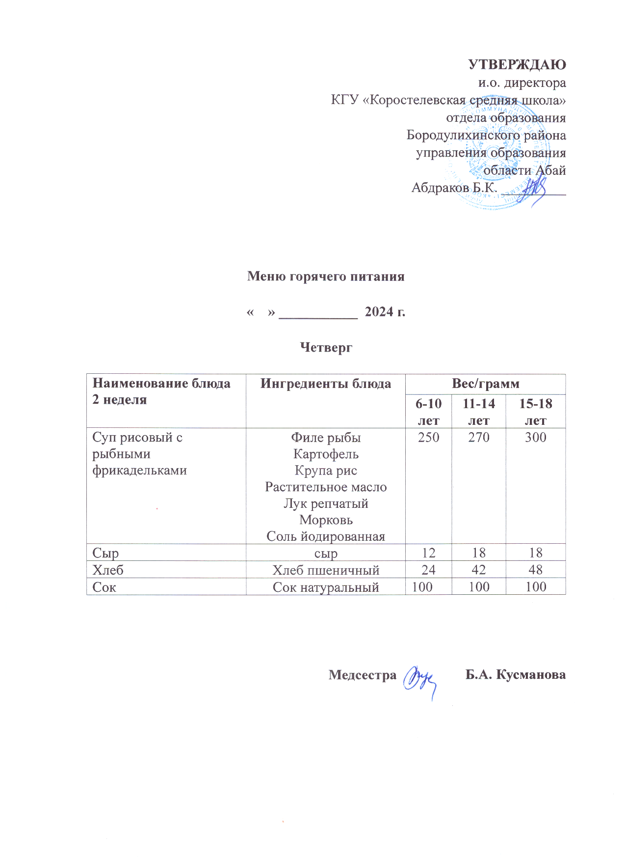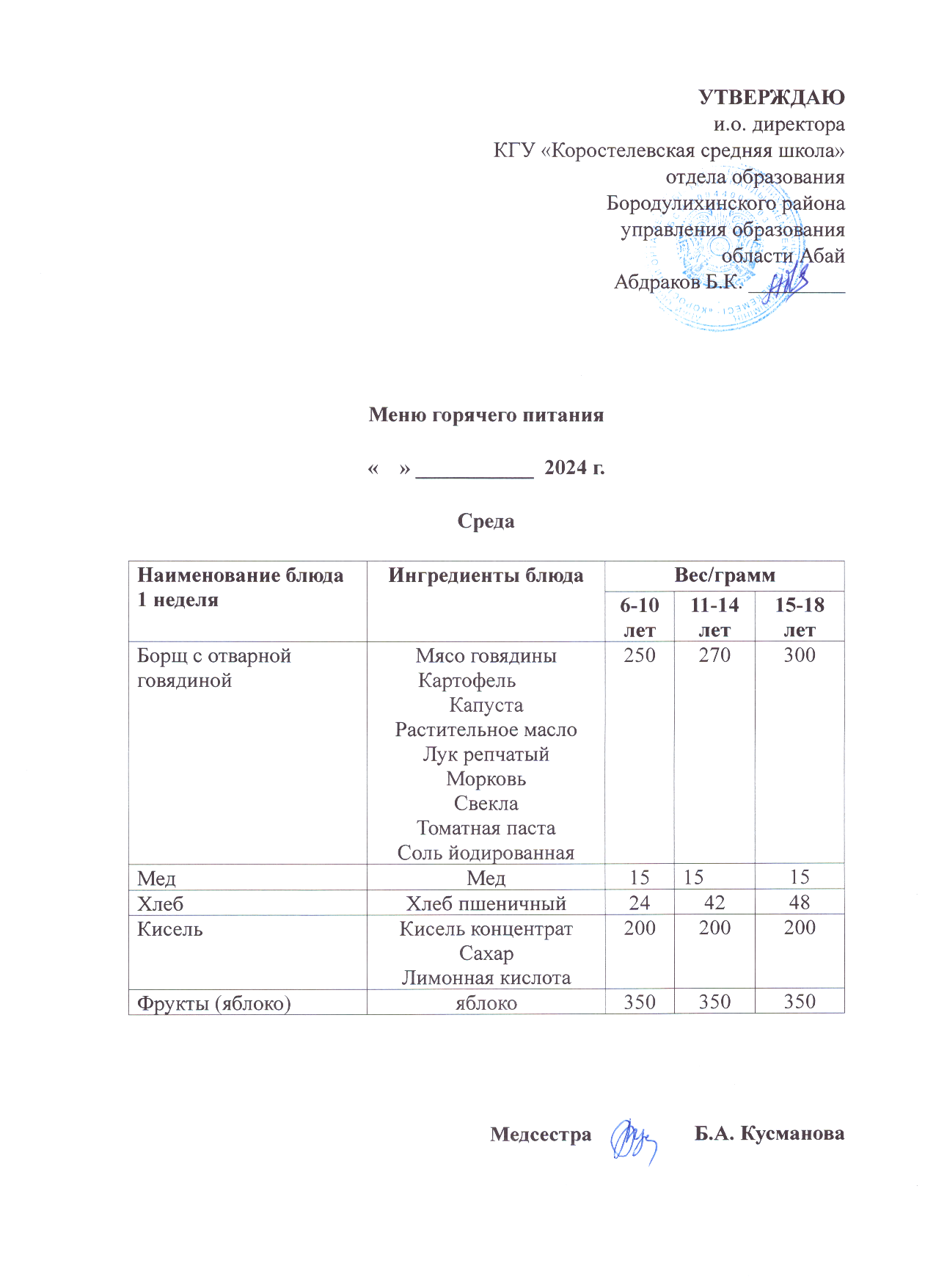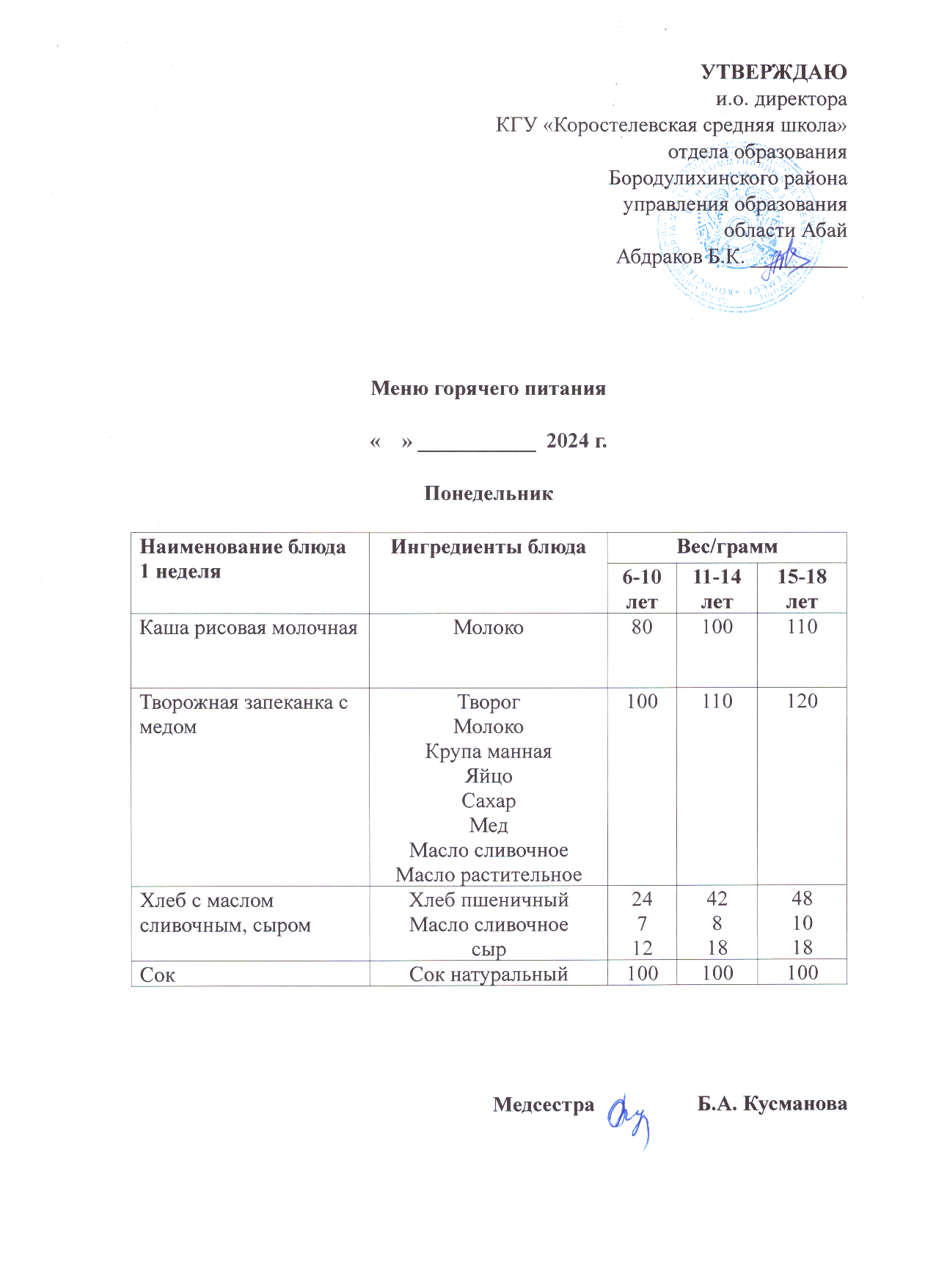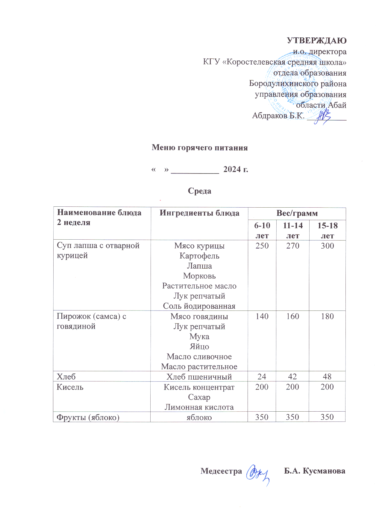 Меню горячего питания школьной столовой 2024-2025 уч.год » КГУ «Коростелевская средняя школа»
