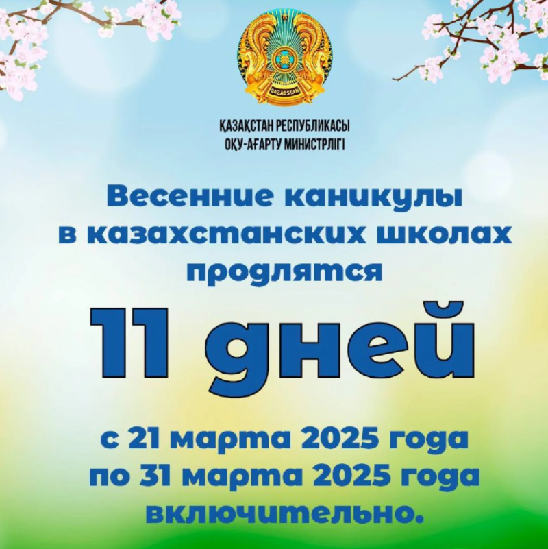 Весенние каникулы в казахстанских школах продлятся 11 календарных дней — с 21 марта 2025 года по 31 марта 2025 года включительно