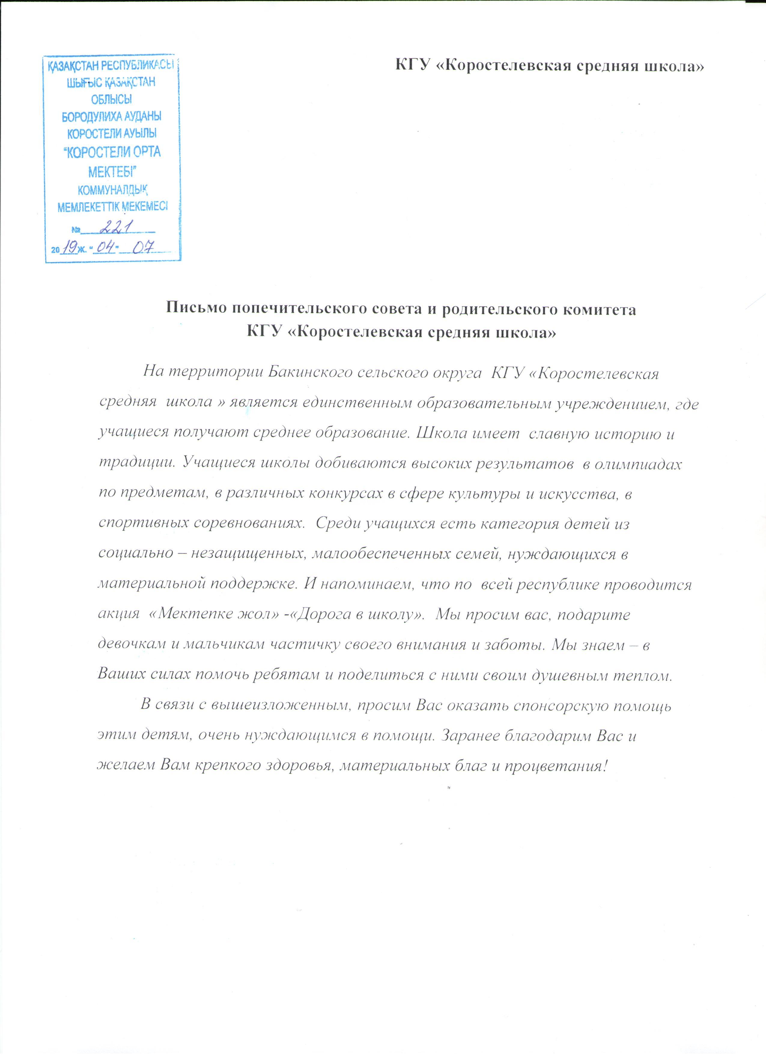 "ШҚО Бородулиха ауданының білім бөлімі" ММ "Коростели орта мектебі" КММ жыл сайын ұйымдастырылатын республикалық "Мектепке жол" акциясына белсене ат салысты. Акцияға қатысып, оқушыларды мектепке дайындауға ат салысуға, Бақы ауылдық округінде жұмыс істеп отырған барлық ұйымдарға қамқоршылық ұйымы хат жолдады. "Қызыл Ауыл" шекара заставасы, "Ауыл" (автомобильдік) ШББ, "Тұлпар" ШҚ, жеке кәсіпкер Сулейменов А.А. қол ұшын созып көмек көрсетті.