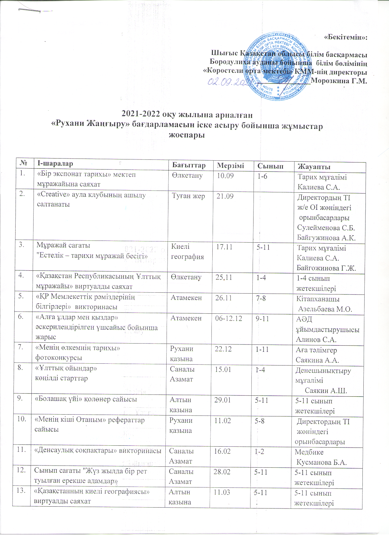 02 сентябрь 2021 0 1 2 3 4 5 2021-2022 оқу жылына арналған "Рухани Жаңғыру" бағдарламасын іске асыру бойынша жұмыстар жоспары