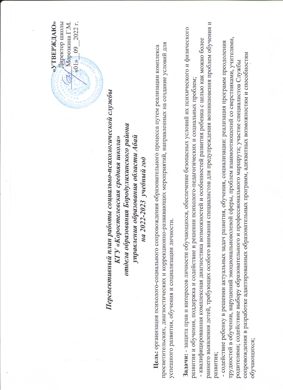 Перспективный план работы социально-психологической службы КГУ «Коростелевская средняя школа» отдела образования Бородулихинского района управления образования области Абай на 2022-2023 учебный год