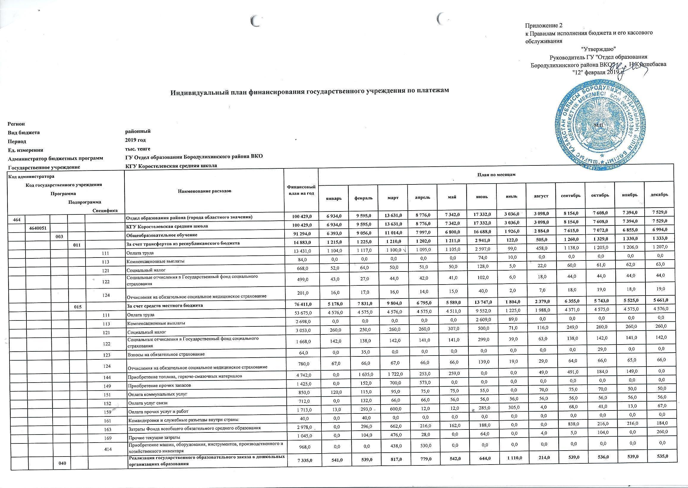 Индивидуальный план финансирования на 2019 год » КГУ «Коростелевская средняя школа»